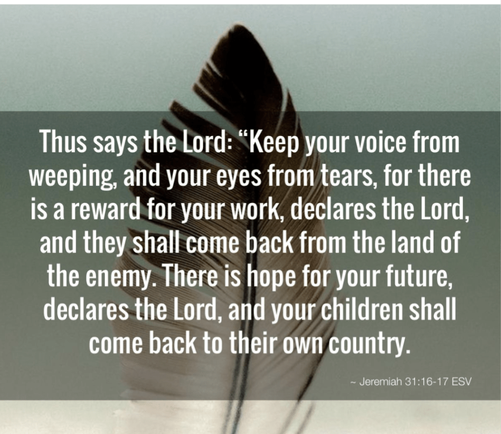 At that very moment my phone alerted me of a message. A message from my friend. She was obedient to share Jeremiah 31:16-17 with me as she felt it was for me at that very time.