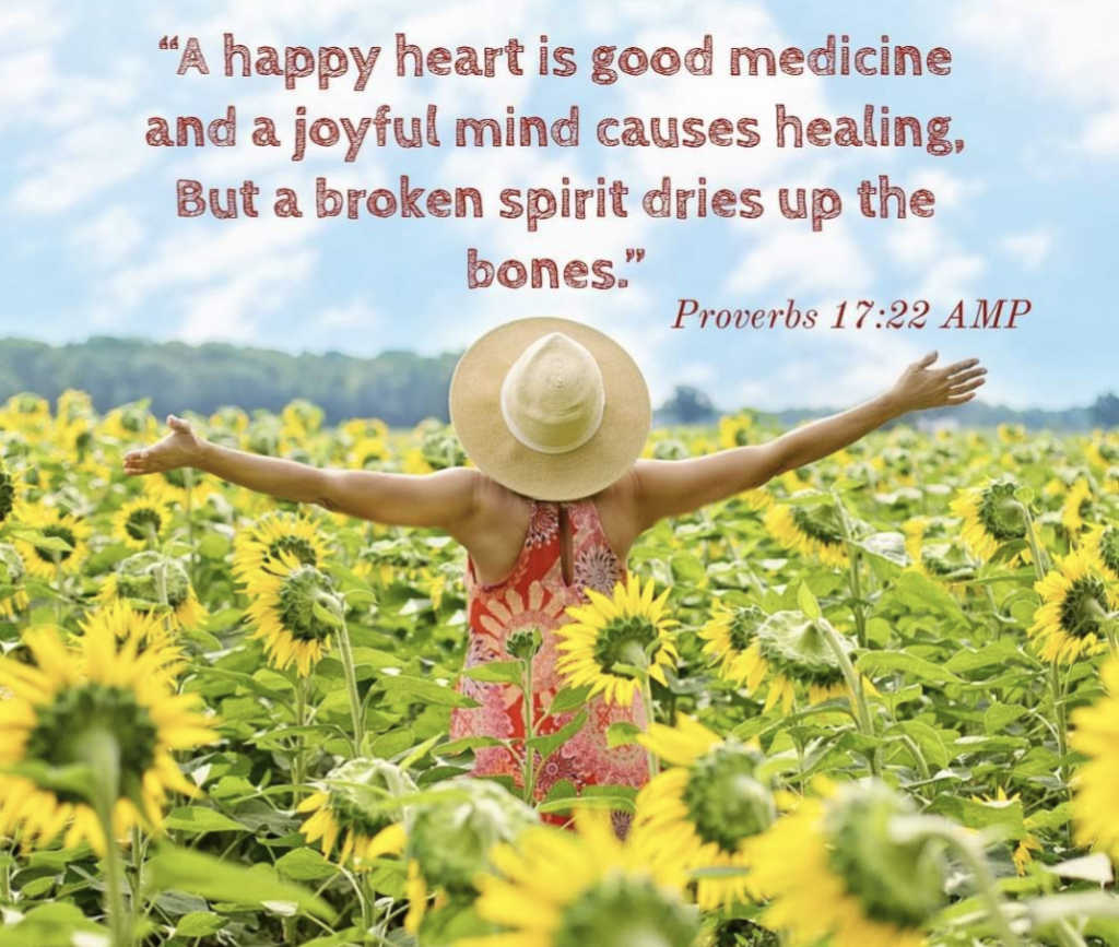 Joy is a fruit of the Spirit. Keeping our focus on Christ is key. He loves us. He is in charge no matter what things look like. Joy brings healing. We can laugh and enjoy our blessings because of the hope found in Christ.